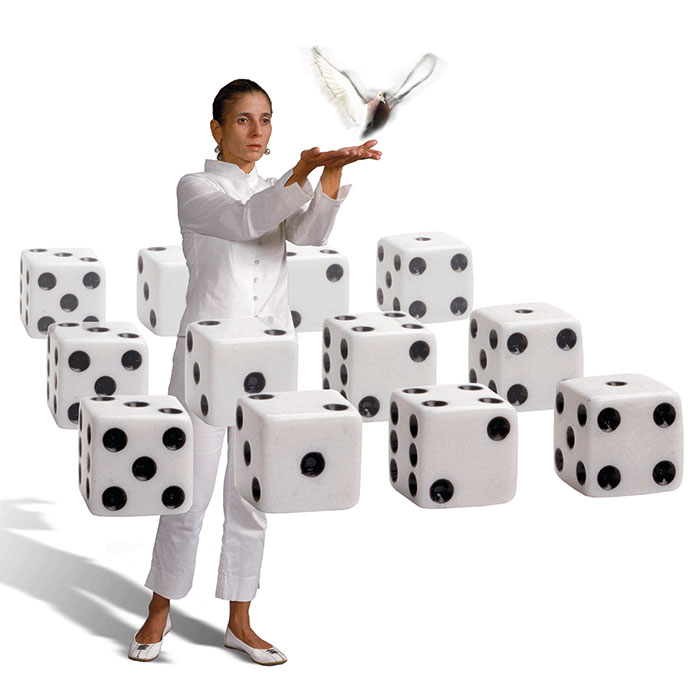 Les cinq objets emprunteront (jalonneront) le tracé visuel dans l’ordre suivant : Le sac en papier ; Rame (de papier) avec pommes ; Cubes ; L’arbre ; Le Cerf volant.