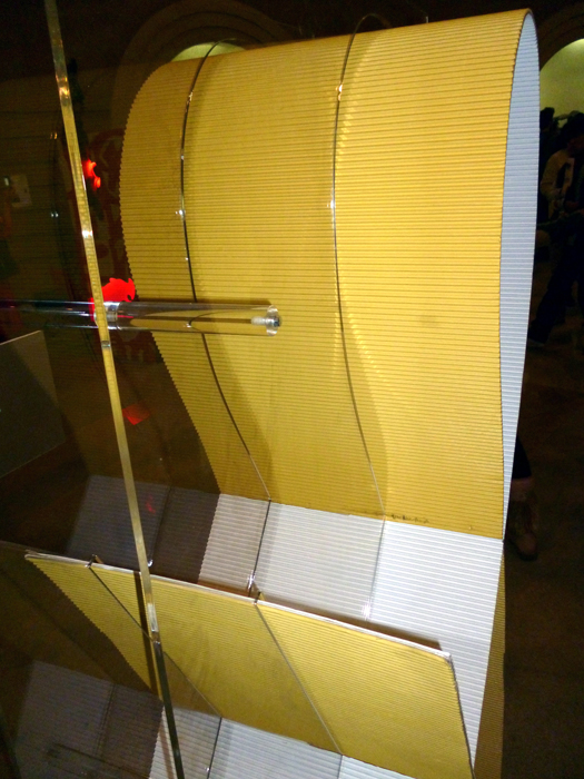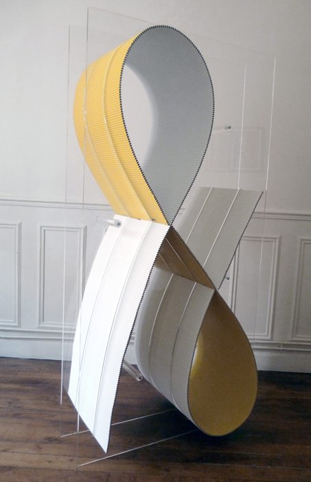Le projet présente une surface plane qui, par torsion et assemblage, acquiert du volume. La surface plane est constituée de deux bandes de cartons ondulées longues de 6 mètres collées les unes contre les autres qui sont peintes en blanc d’un côté et en jaune de l’autre. Pour en faciliter l’exposition, j’ai conçu un support qui maintienne le module debout, consistant dans deux plaques de Plexiglas qui sont fixées entre elles par de petites tiges cylindriques et qui sont découpées d’après le contour du « Ruban sans fin ». Le support ainsi conçu permet l’exposition du module en trois plans, horizontal, vertical et latéral, le projet initial comportant trois modules. L’installation peut, en effet, se présenter sous la forme de plusieurs modules identiques ou autrement assemblés, exposés en série ou combinés.