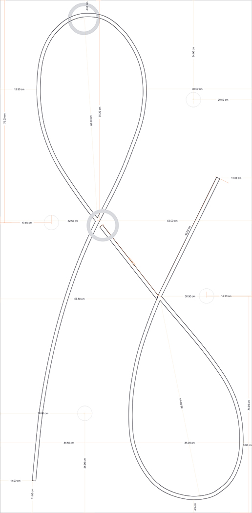 « Le ruban sans fin » reprend/résulte/dérive du « Nœud sans fin », motif spécifique de l’art décoratif chinois qui signifie « longue vie sans déboires ». J’ai choisi ce symbole justement parce qu’il signifie un état continu de longue vie, sans fin. « Le nœud sans fin » n’a ni commencement ni fin, il est confectionné d’une ganse, d’un fil ou d’une ficelle. Pour ma part, j’ai choisi la bande, le ruban, qui dans mon projet représente un chemin sans fin. Le module présente une fraction de cette bande, une étape de ce chemin, juste ce que le moment présent nous permet de parcourir comme voyage dans ce monde.