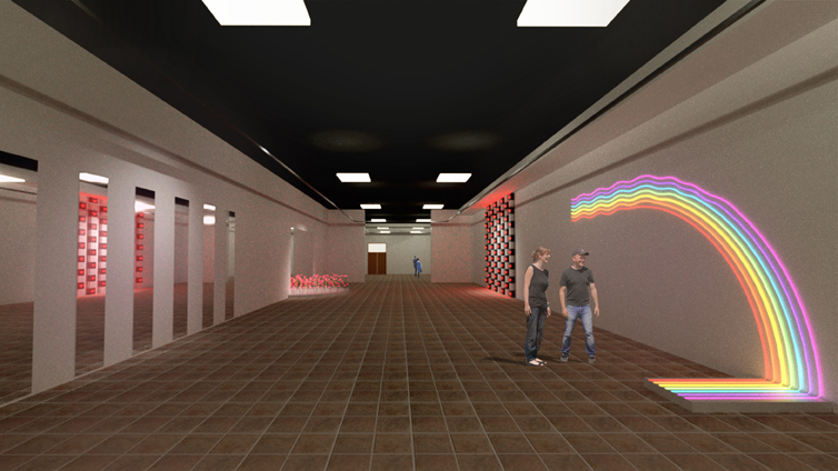 « Arc-en-ciel », la deuxième installation, est constitué de sept fils de néon qui, à partir du sol, commencent à grimper au mur en suivant un contour ondoyant et décalé comme une fumée qui s’estompe à l’horizon. Juste en face, une suite de six glaces, accrochées au mur et disposées à des intervalles égaux.