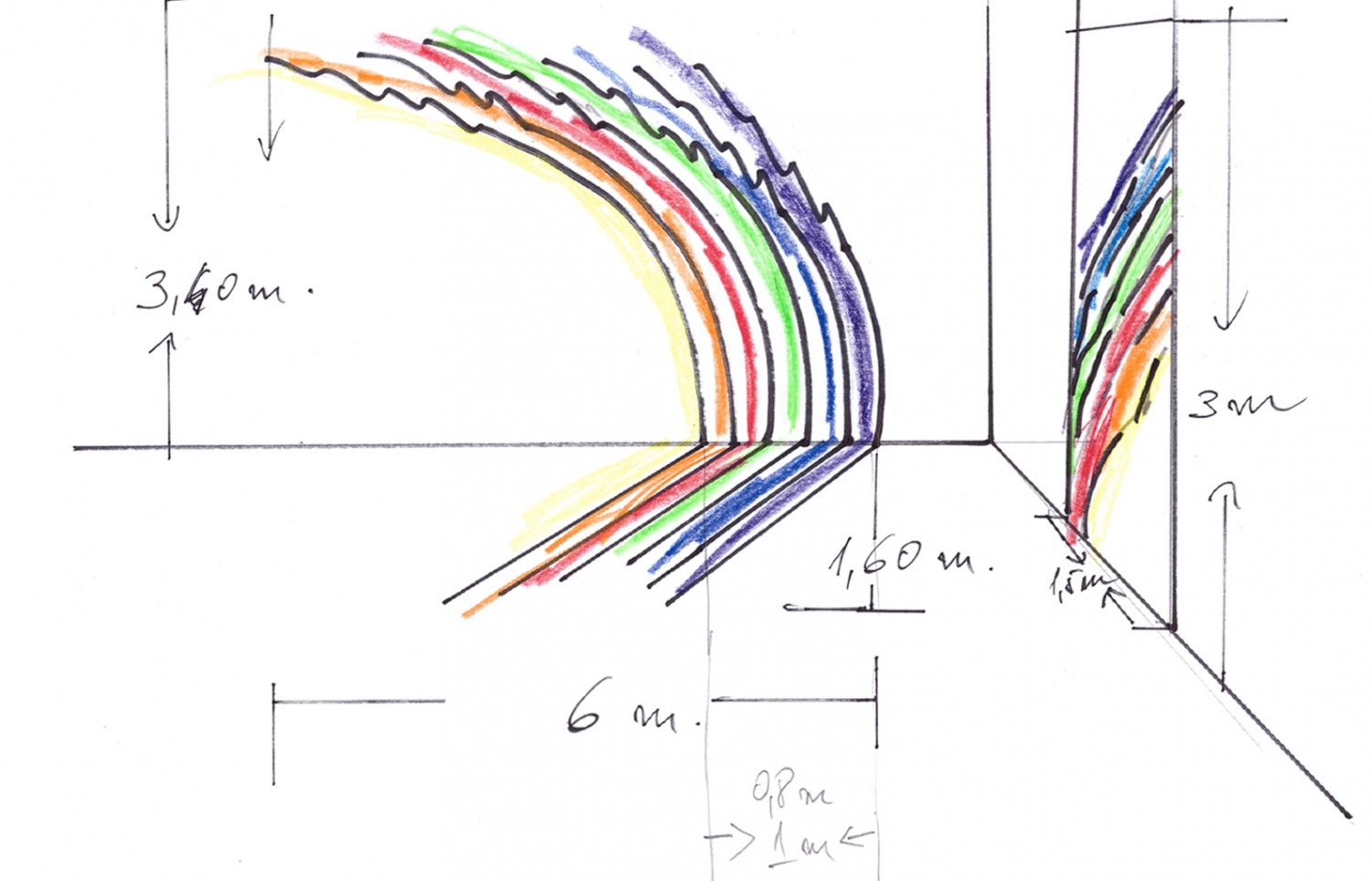 « Réflexions/Arc-en-ciel » est un projet qui propose une nouvelle manière de réaliser une exposition, un trajet qui rompe avec les codes et les visions traditionnels. Il présente une série de douze dessins noir et blanc, deux installations lumineuses réalisées en néon et matériaux réfléchissants, ainsi qu’un atelier de création pour des enfants en âge scolaire (de 6 à 14 ans). Que se passe-t-il lorsque le point de vue est radicalement modifié ? Les visiteurs sont invités à parcourir un trajet plus inattendu, de telle sorte qu’ils activent eux-mêmes un jeu infini de reflets. Traversant les salles et les vastes installations, ils deviennent partie prenante d’une chorégraphie de lumières, de reflets, de formes géométriques et d’ombres mouvantes. Les installations lumineuses et les modules disposés tout au long de ce trajet peuvent témoigner de mes propres recherches sur les mécanismes de la perception et la construction de l’espace d’exposition.