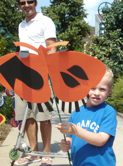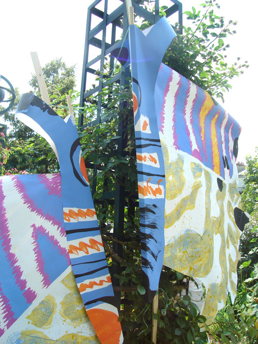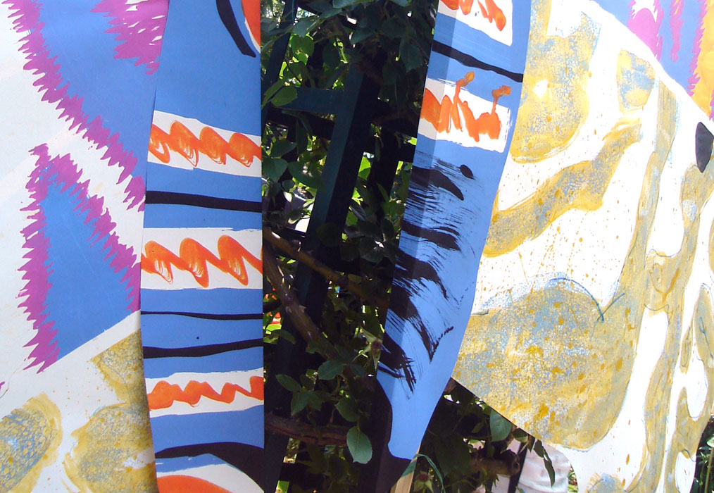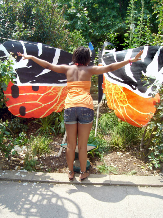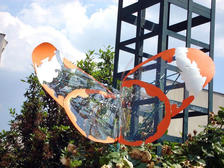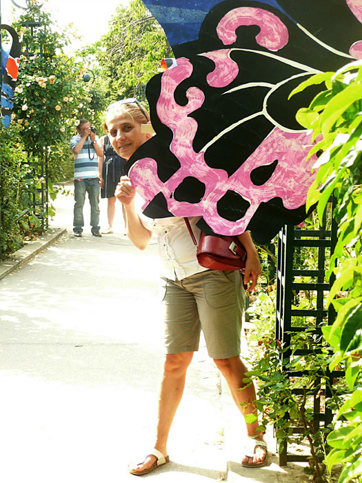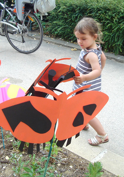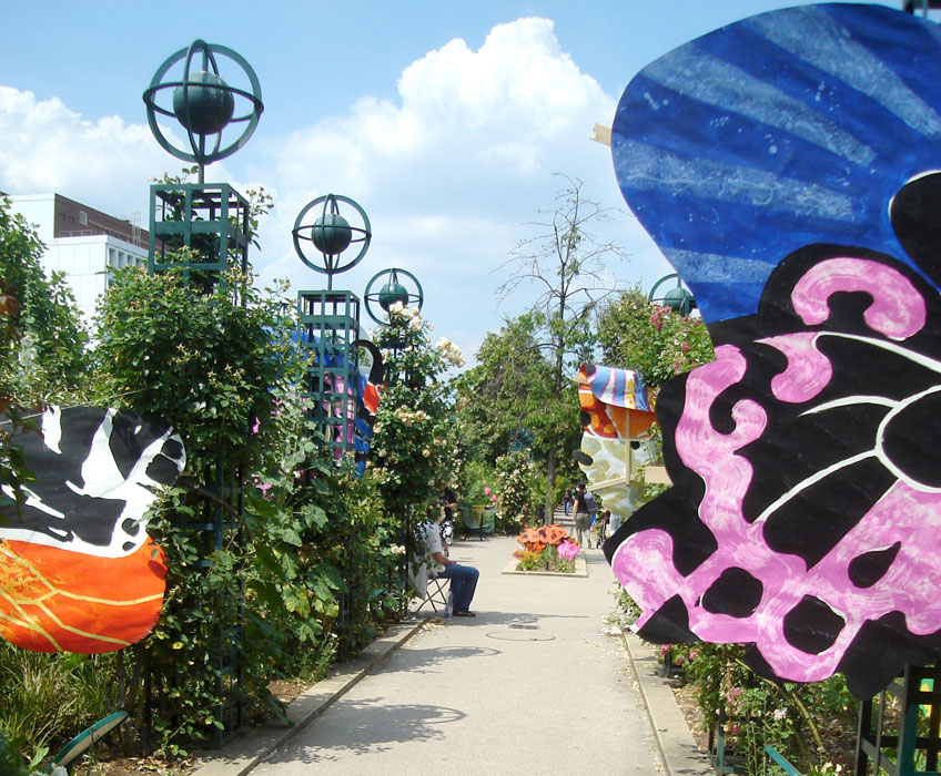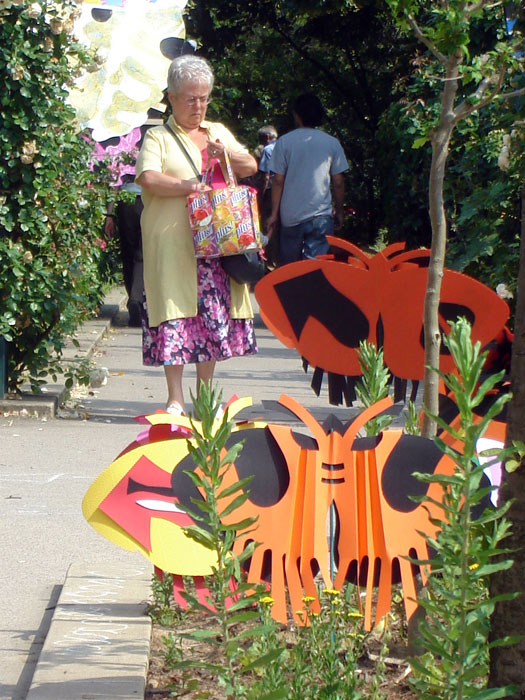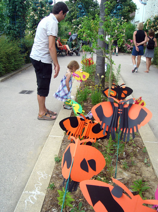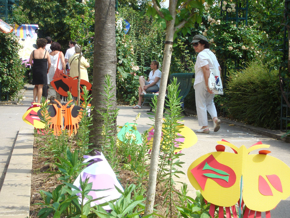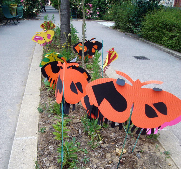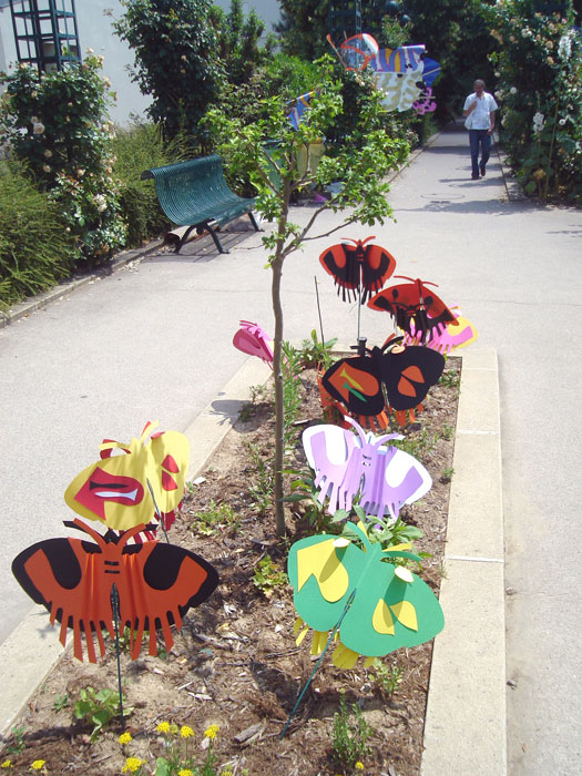 Les planches représentant les ailes de papillons sont suspendues à la structure métallique de la pergola le long de l’allée au niveau supérieur de pilons mais situées en sorte qu’elles puissent permettre le passage des visiteurs. Les petits papillons sont accrochés, chacun à une baguette, et plantés dans l’espace vert, central, au niveau de l’escalier passage Hennel.