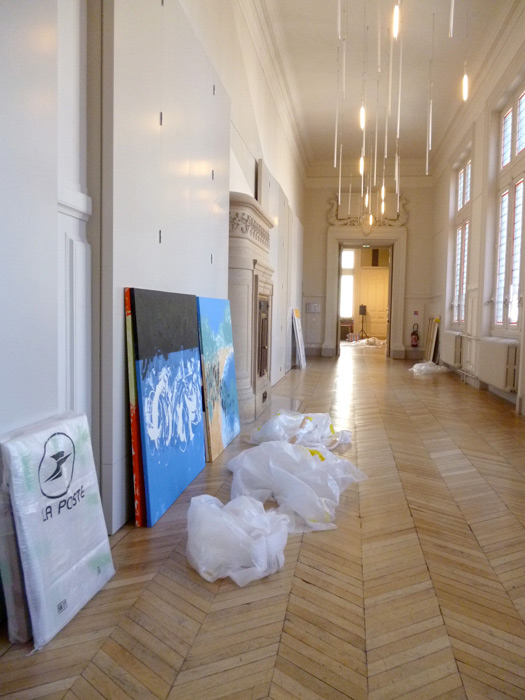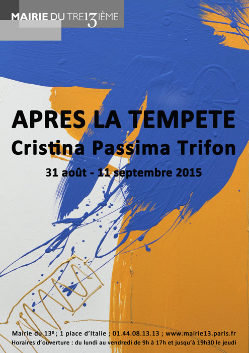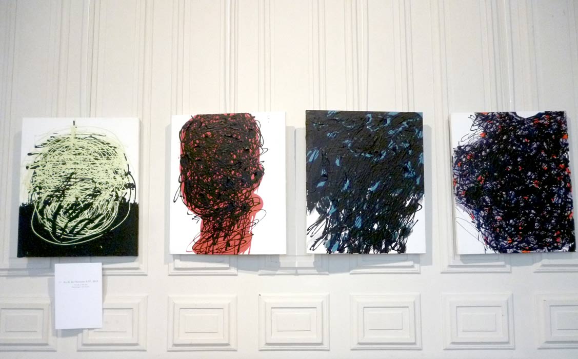 Pour les Galeries Athéna et Antichambre de la Mairie du XIIIe, j'ai choisis de présenter outre la série de neuf peintures « WTC – 9/11 » , 2012-2014, grand format (195 x 130 cm) acrylique sur toile, une série de neuf « Paysages et Nuages », 2014-2015, le mobile « Au-dessus des nuages », 2009, et des dessins noir et blancs, 2014-2015.