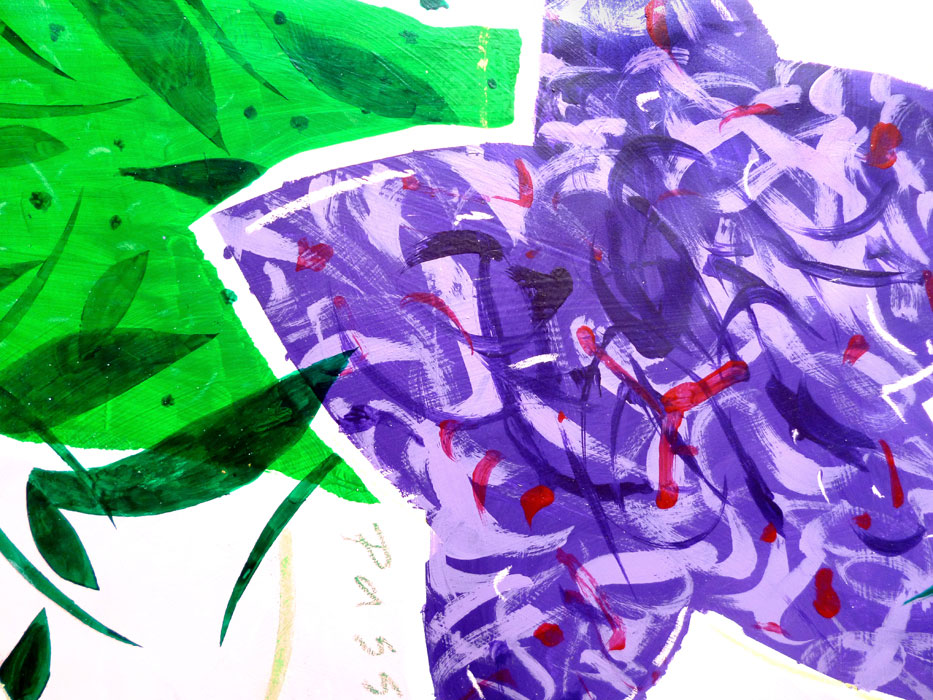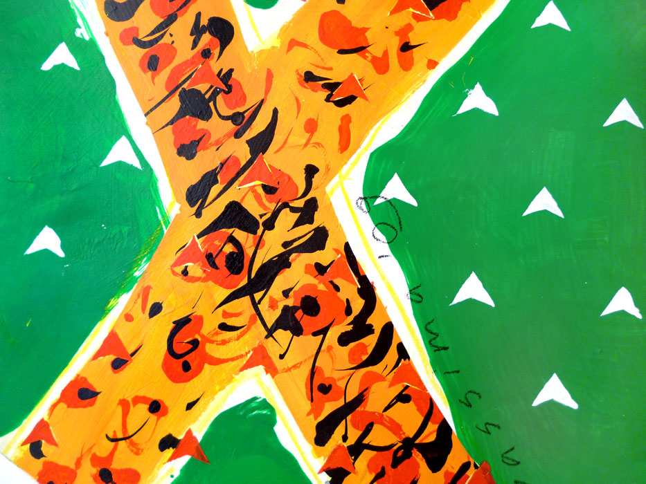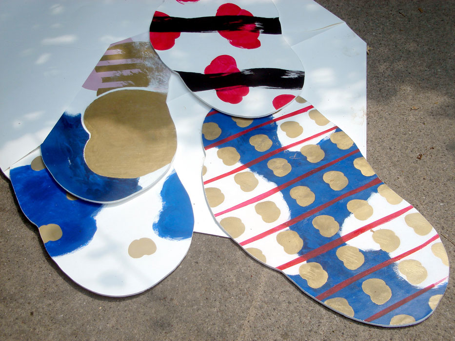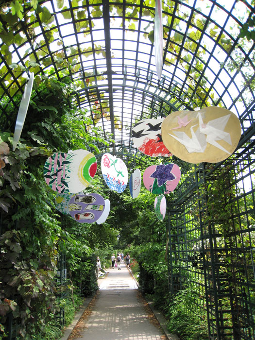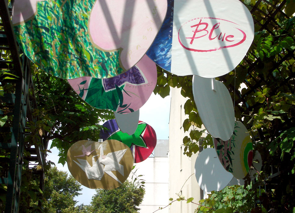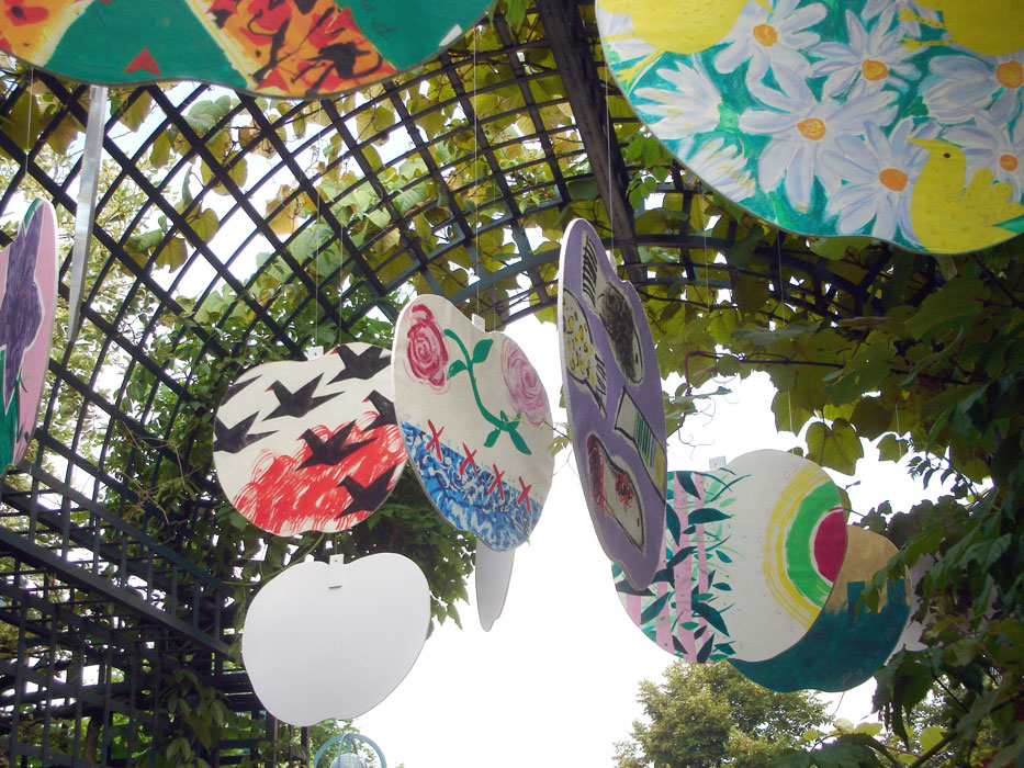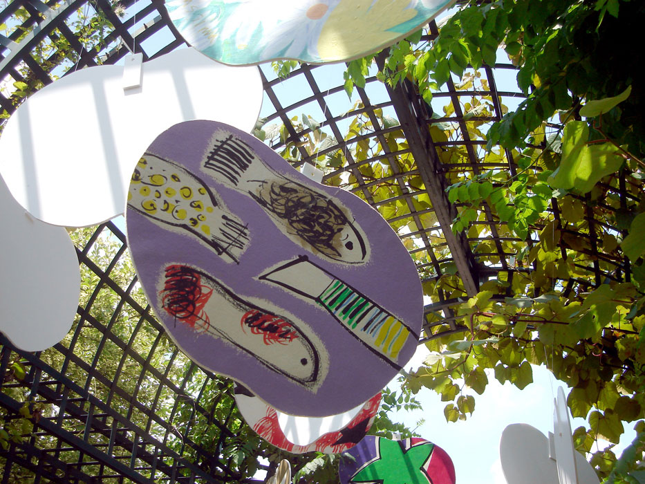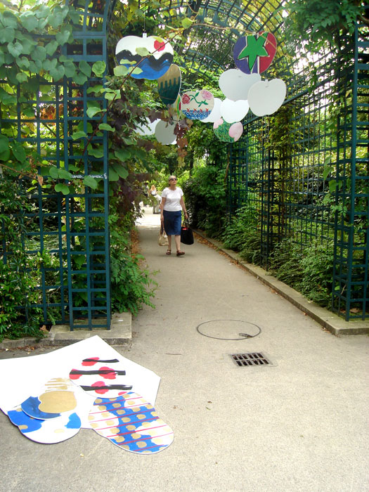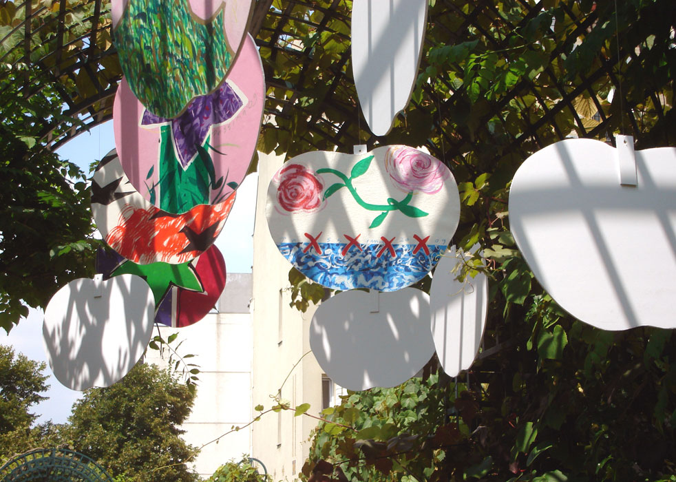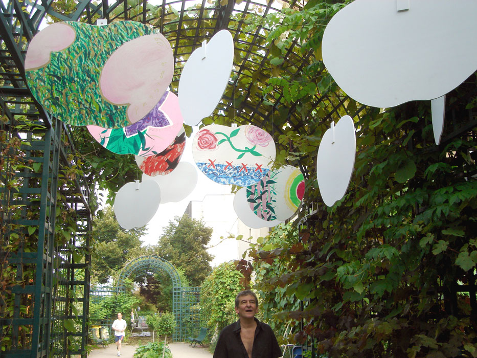 La partie suspendue de cette installation est mobile tandis que la partie fixe est posée au sol. Elle est réalisée par des découpages légers en plaques de mousse d’après un contour suivant des formes simples et faciles à reconnaître. La réalisation graphique des dessins, collés sur ces découpages, consiste en une mixture de signes et de formes graphiques d’une extrême simplicité. La lisibilité des structures est assurée par l’utilisation des plusieurs sortes de papiers, de masques superposés et de collages, par la particularité de la structure chromatique de l’ensemble, par l’application des couleurs selon plusieurs techniques différentes, en sorte qu’elles soient bien mises en valeur par le support. La pergola que nous proposons se trouve sur la promenade plantée au niveau de l’intersection de l’avenue Daumesnil et du boulevard Diderot.