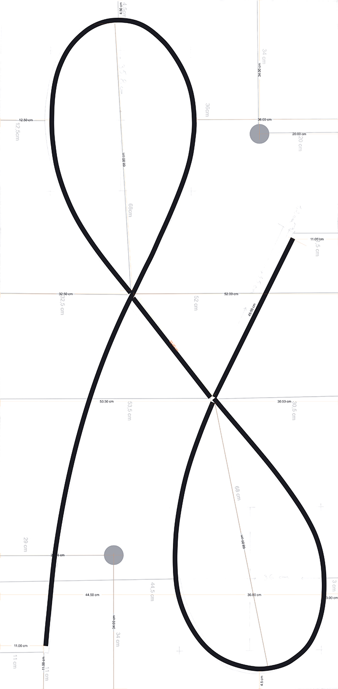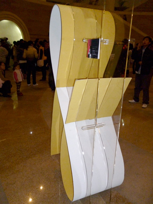 « Le ruban sans fin » reprend/résulte/dérive du « Nœud sans fin », motif spécifique de l’art décoratif chinois qui signifie « longue vie sans déboires ». J’ai choisi ce symbole justement parce qu’il signifie un état continu de longue vie, sans fin. « Le nœud sans fin » n’a ni commencement ni fin, il est confectionné d’une ganse, d’un fil ou d’une ficelle. Pour ma part, j’ai choisi la bande, le ruban, qui dans mon projet représente un chemin sans fin. Le module présente une fraction de cette bande, une étape de ce chemin, juste ce que le moment présent nous permet de parcourir comme voyage dans ce monde.