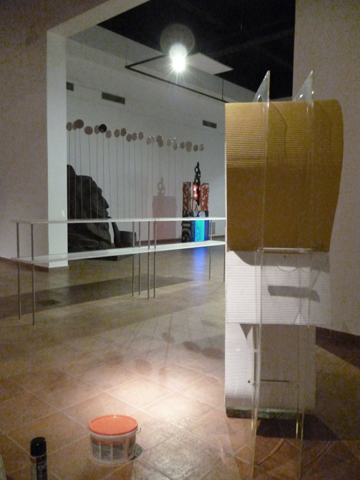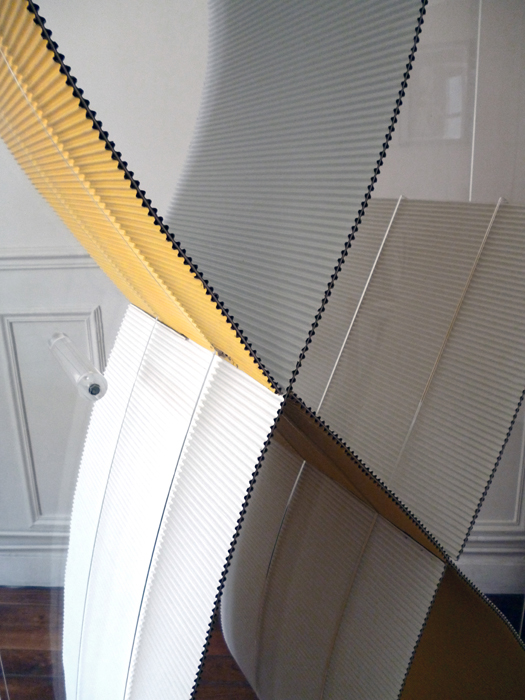 Le projet présente une surface plane qui, par torsion et assemblage, acquiert du volume. La surface plane est constituée de deux bandes de cartons ondulées longues de 6 mètres collées les unes contre les autres qui sont peintes en blanc d’un côté et en jaune de l’autre. Pour en faciliter l’exposition, j’ai conçu un support qui maintienne le module debout, consistant dans deux plaques de Plexiglas qui sont fixées entre elles par de petites tiges cylindriques et qui sont découpées d’après le contour du « Ruban sans fin ». Le support ainsi conçu permet l’exposition du module en trois plans, horizontal, vertical et latéral, le projet initial comportant trois modules. L’installation peut, en effet, se présenter sous la forme de plusieurs modules identiques ou autrement assemblés, exposés en série ou combinés.