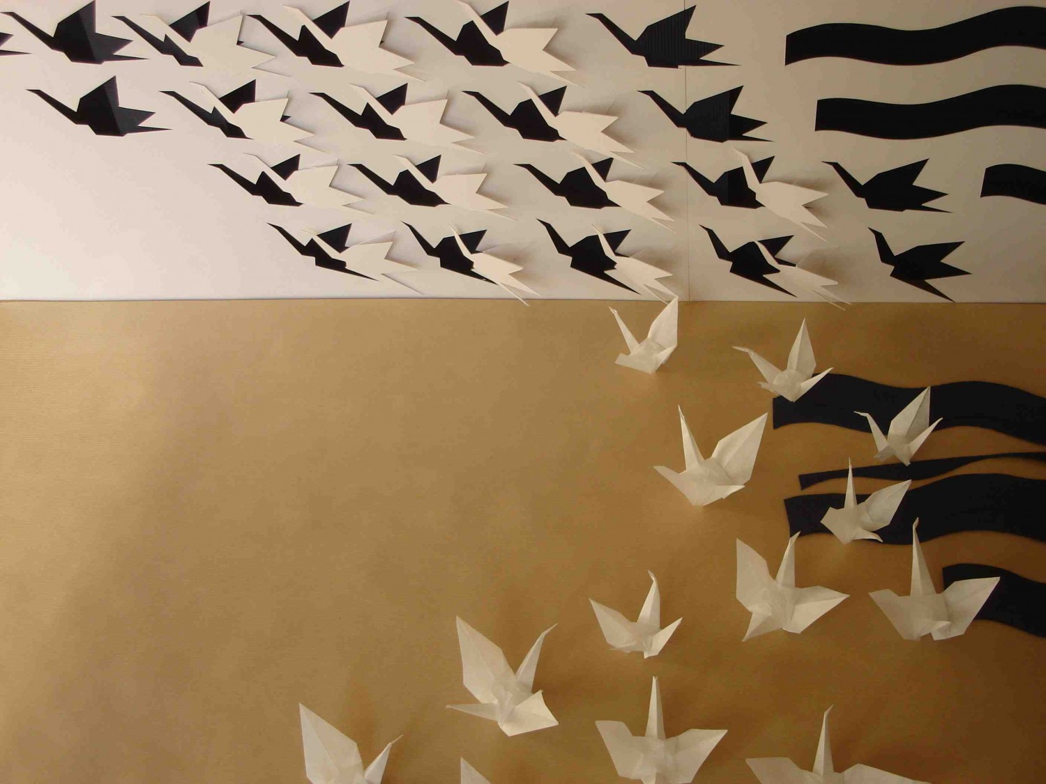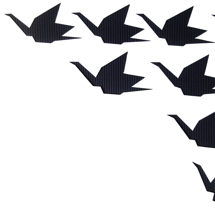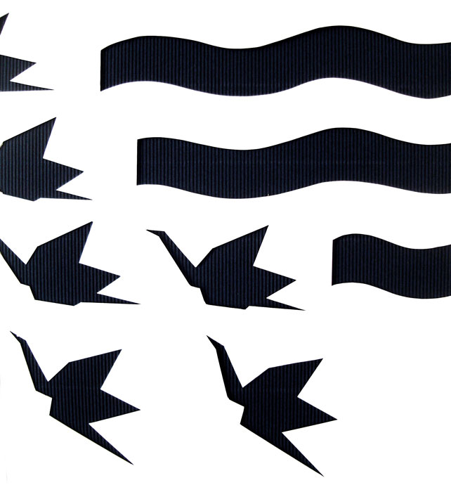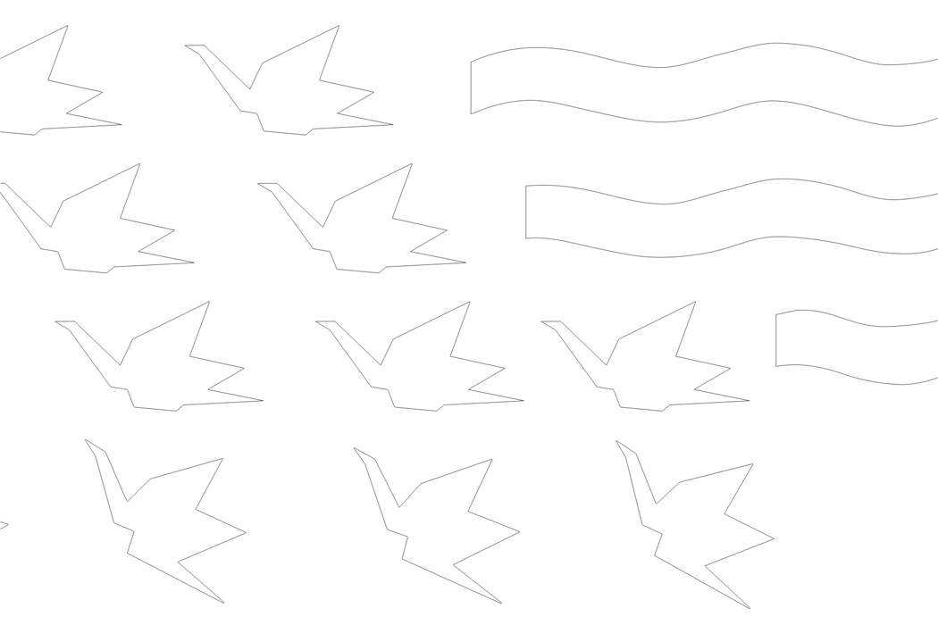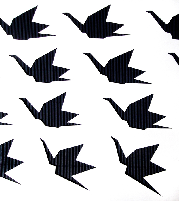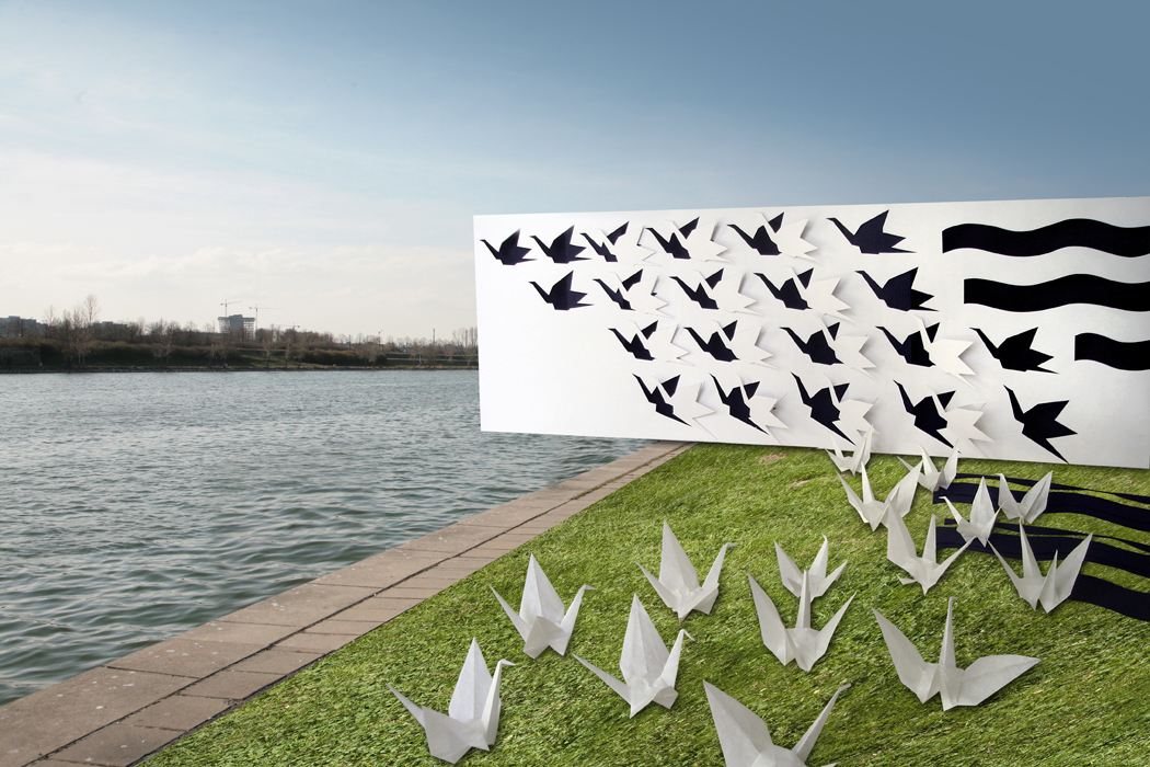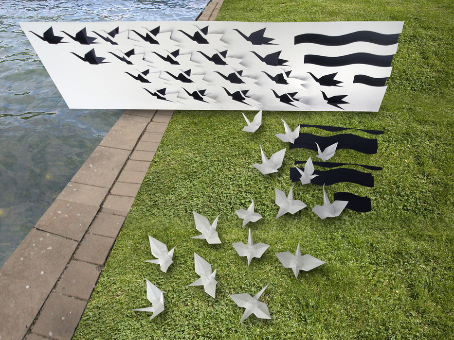 Les oiseaux sont associés à l’idée de vol. La position des grues en trois dimensions se trouvant au sol indique leur décollage imminent. Leur disposition, qui épouse une courbe aléatoire, suggère le mouvement de rotation des grues entamé après le décollage. Enfin, sur le plan vertical, le vol proprement dit est signifié par le jeu des découpes des grues figurant sur le panneau.