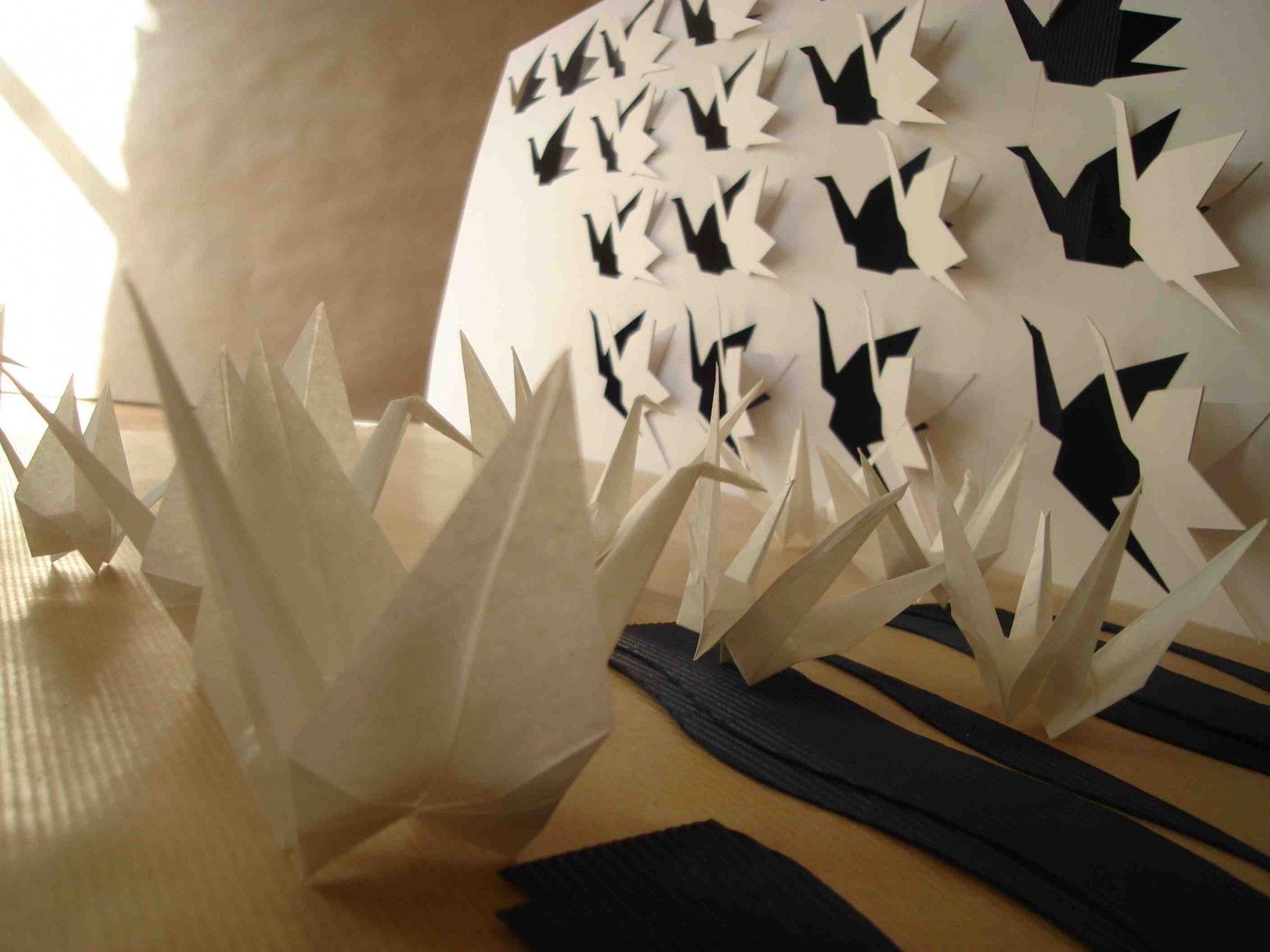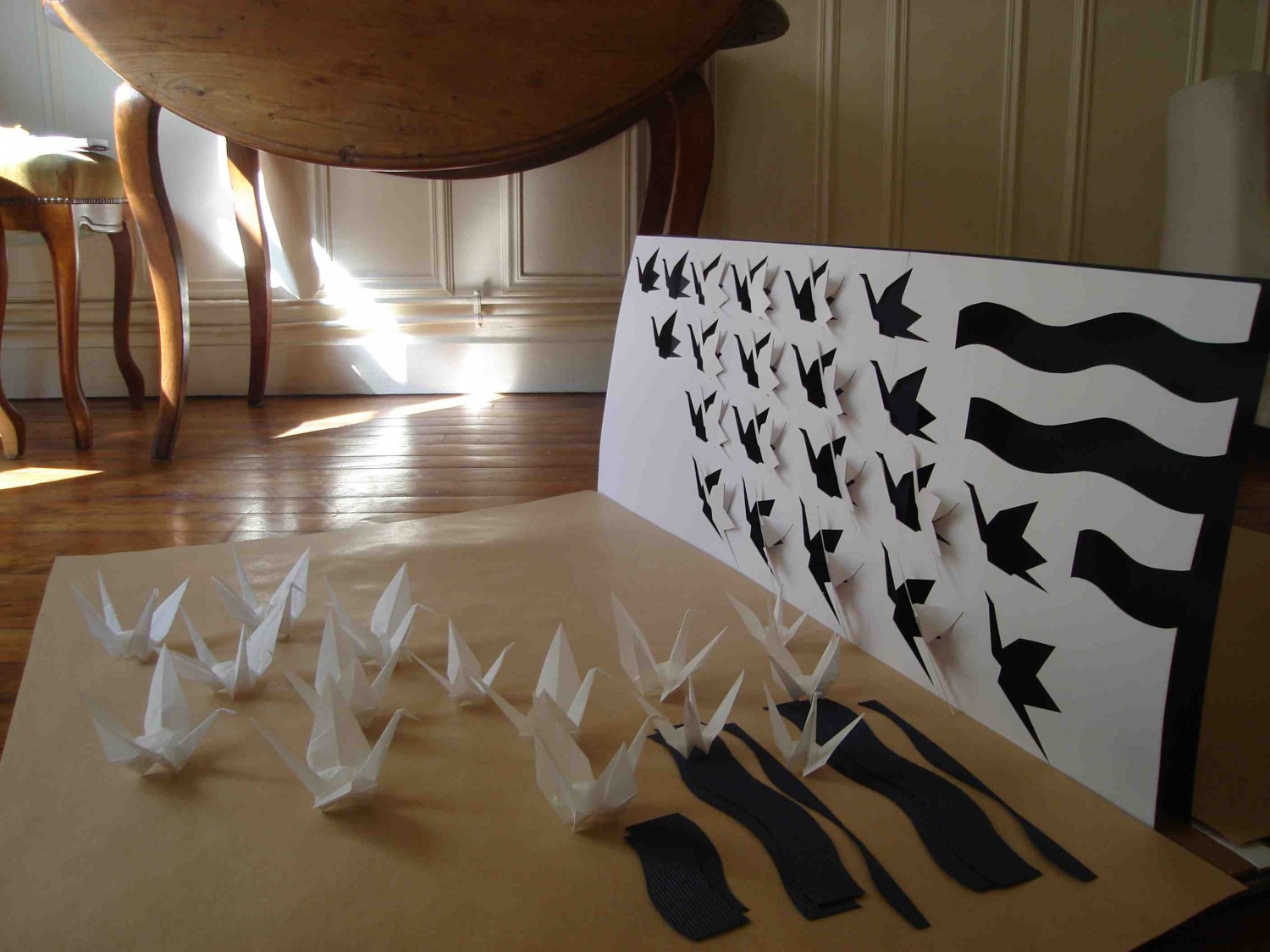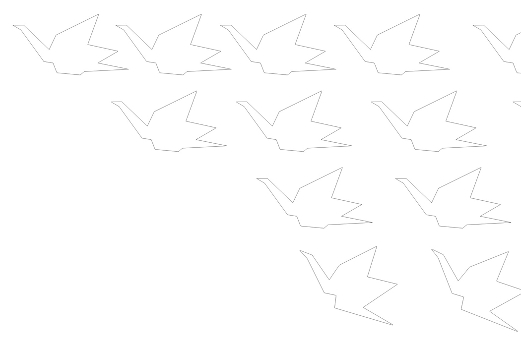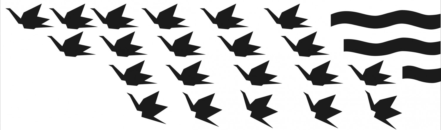 Les oiseaux sont associés à l’idée de vol. La position des grues en trois dimensions se trouvant au sol indique leur décollage imminent. Leur disposition, qui épouse une courbe aléatoire, suggère le mouvement de rotation des grues entamé après le décollage. Enfin, sur le plan vertical, le vol proprement dit est signifié par le jeu des découpes des grues figurant sur le panneau.