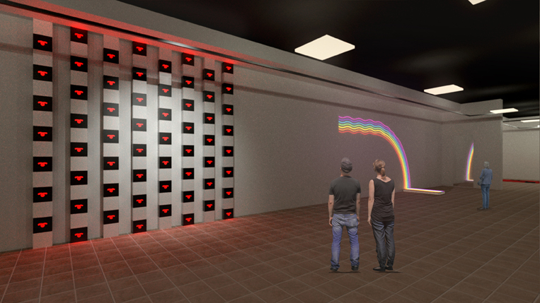 « Arc-en-ciel », la deuxième installation, est constitué de sept fils de néon qui, à partir du sol, commencent à grimper au mur en suivant un contour ondoyant et décalé comme une fumée qui s’estompe à l’horizon. Juste en face, une suite de six glaces, accrochées au mur et disposées à des intervalles égaux.