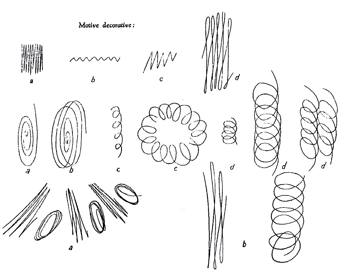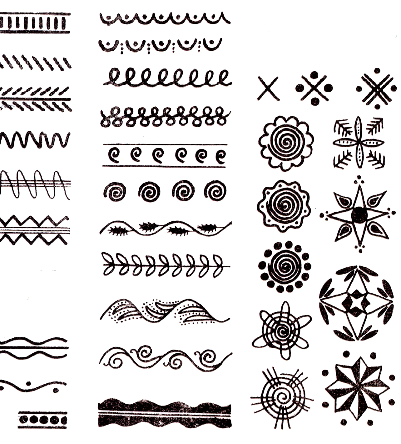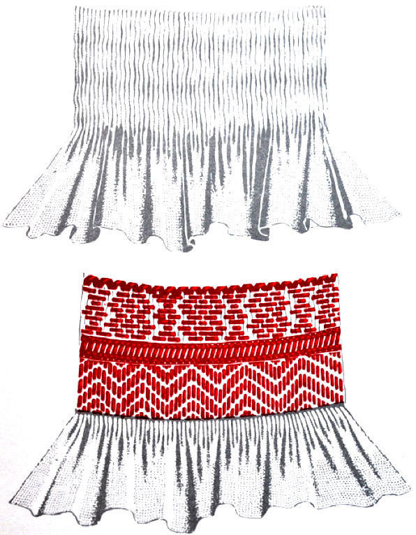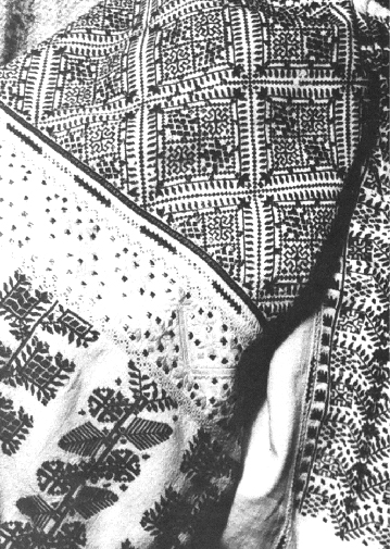 1re Salle : Une série de douze dessins noir et blanc sur le thème des motifs de couture traditionnels roumains en « point de croix » et des blouses paysannes brodées.