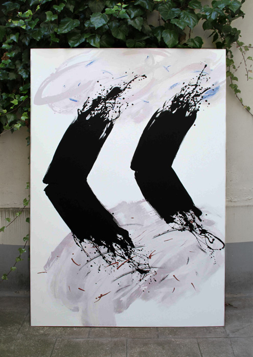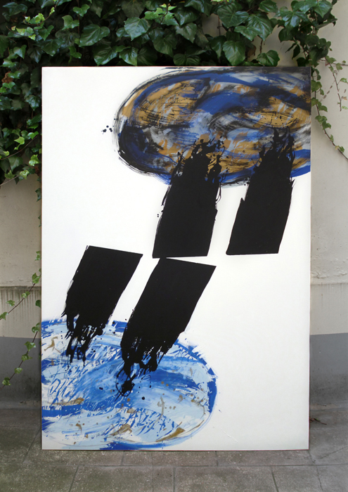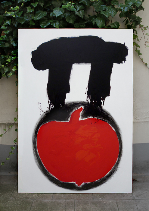 Aussi, le nuage de fumée cendrée ou noire, les deux barres verticales, les silhouettes des tours et la pomme, sont-ils des thèmes récurrents pour moi. Comme je travaille avec des symboles et éléments abstraits, alors, j’ai toute suite penser faire quelque chose sur ce thème ou qui peut avoir une liaison avec ce sujet, mais j’ai eu du mal à trouver ou de visualiser ce qui allait devenir la forme finale de mes tableaux.